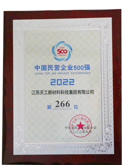 近日,全國(guó)工商聯(lián)發(fā)布“2022中國(guó)民營(yíng)企業(yè)500強(qiáng)”榜單。江蘇天工新材料集團(tuán)有限公司強(qiáng)勢(shì)上榜,位列500強(qiáng)榜單第266位。這是天工連續(xù)13年榮膺“中國(guó)民營(yíng)企業(yè)500強(qiáng)”。