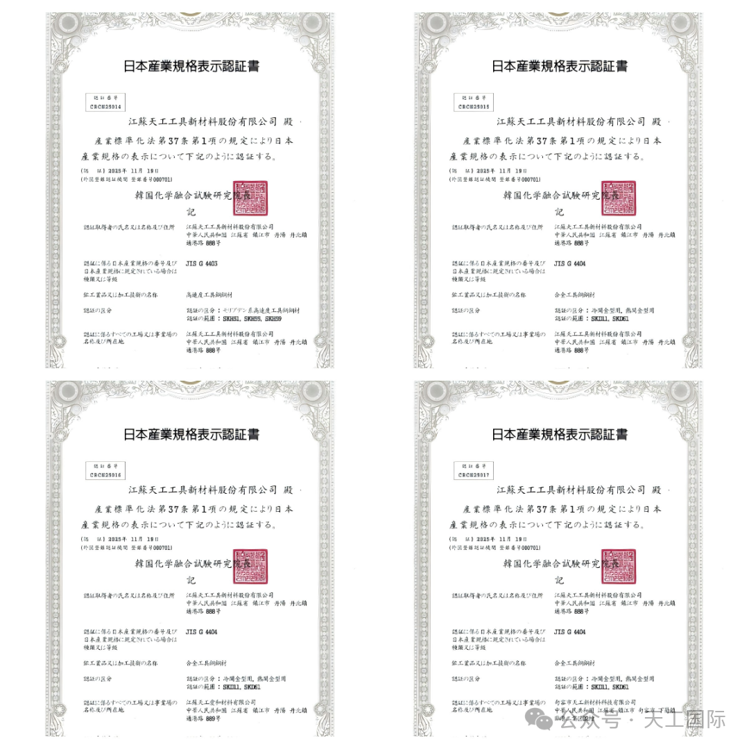 近日,天工國際有限公司下屬企業(yè)江蘇天工工具新材料股份有限公司(以下簡(jiǎn)稱:天工工具新材料)順利通過韓國化學(xué)融合試驗(yàn)研究院(KTR)的嚴(yán)格審核,正式獲得 “JIS G 4404 合金工具鋼” 與 “JIS G 4403 高速工具鋼” 兩項(xiàng)認(rèn)證。這意味著天工工模具鋼產(chǎn)品在化學(xué)成分、性能指標(biāo)、制造工藝及質(zhì)量管理體系等全流程,已全面對(duì)標(biāo)日本工業(yè)標(biāo)準(zhǔn)(JIS)這一國際高端制造領(lǐng)域的頂級(jí)標(biāo)準(zhǔn)體系。